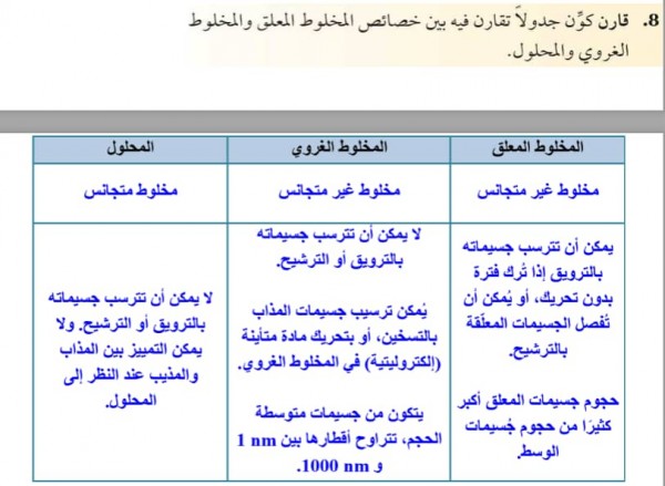 قارن كون جدولا تقارن فيه بين خصائص المخلوط المعلق مجتمع الحلول