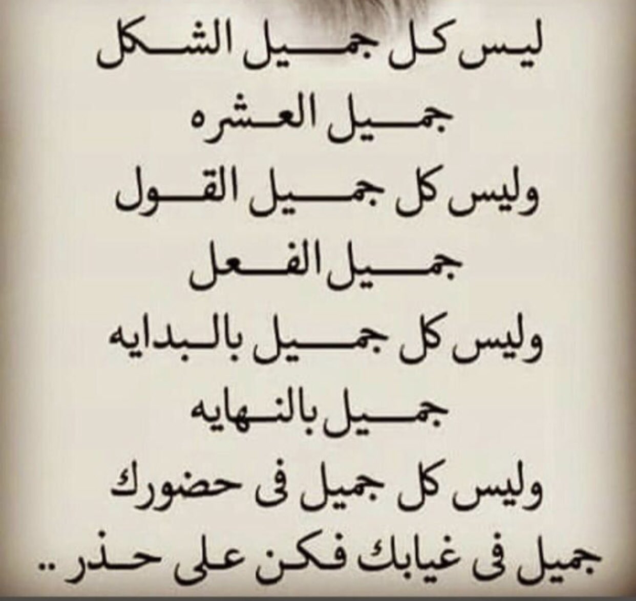 ليس كل جميل الشكل جميل العشرة ليس كل جميل القول جميل الفعل ليس كل جميل بالبداية جميل بالنهاية و ليس كل جميل في حضورك جميل في غيابك فكن على حذر